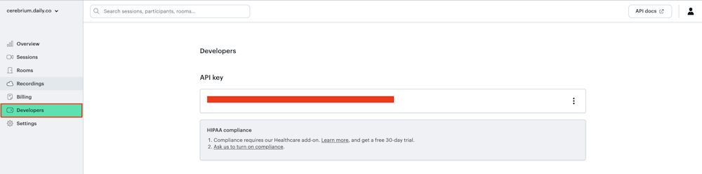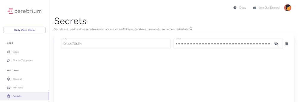 If you don’t have an account you can sign up for one here (they have a generous free tier). Next, we need to get our Daily developer token from our profile in order to authenticate calls.Navigate to the “developers” tab in order to fetch your API key and add this to your Cerebrium Secrets.