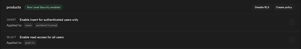 The above is saying that only a client with our Anon key can insert and select records into the database.