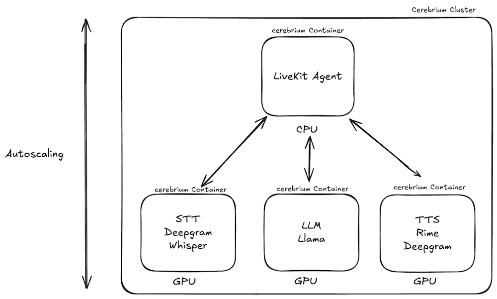 You can think of each container as its own independent autoscaling service. This is required since each service has different concurrency capacity and hardware requirements. For example, Deepgram can take 180 concurrent connections and runs on an A10 GPU whereas a self-hosted llama model can take 10 requests and runs on a H100.