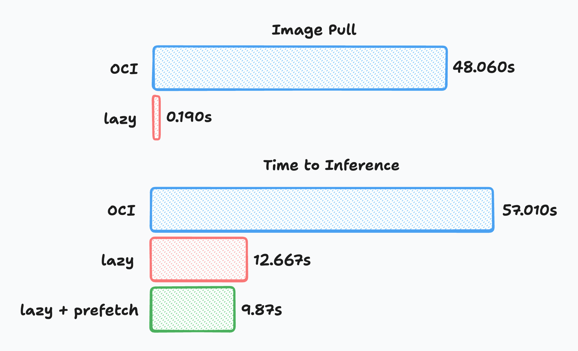 Lazy-loaded containers take slightly longer between container start → model inference because some file reads trigger on-demand fetches. However, that overhead is small compared to the time saved by avoiding the full image pull.